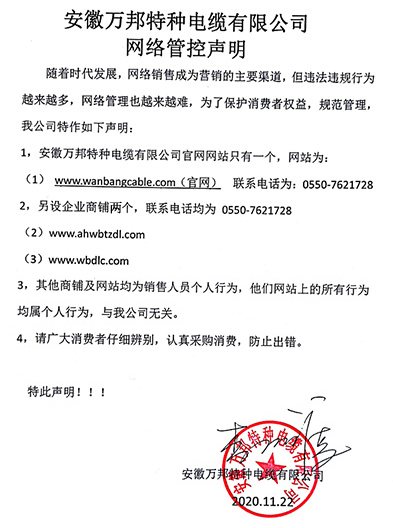 鄭重聲明:安徽萬邦特種電纜有限公司官方網站為:www_wanbangcable_com.szxxys.com,除此之外無任何子網站或合作網站,其余均為假冒偽劣。電話:0550-7621728 13485756353 地 址:安徽省天長市滁州高新技術產業開發區經四路29號